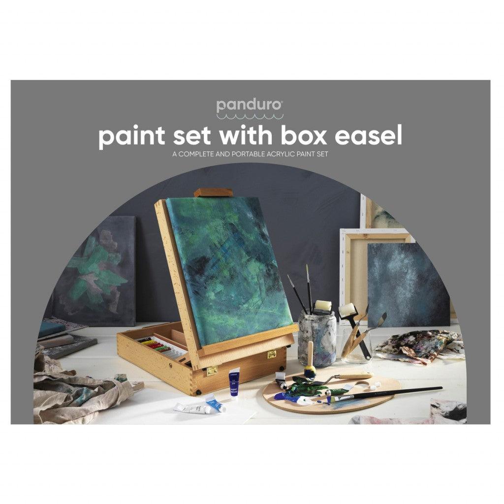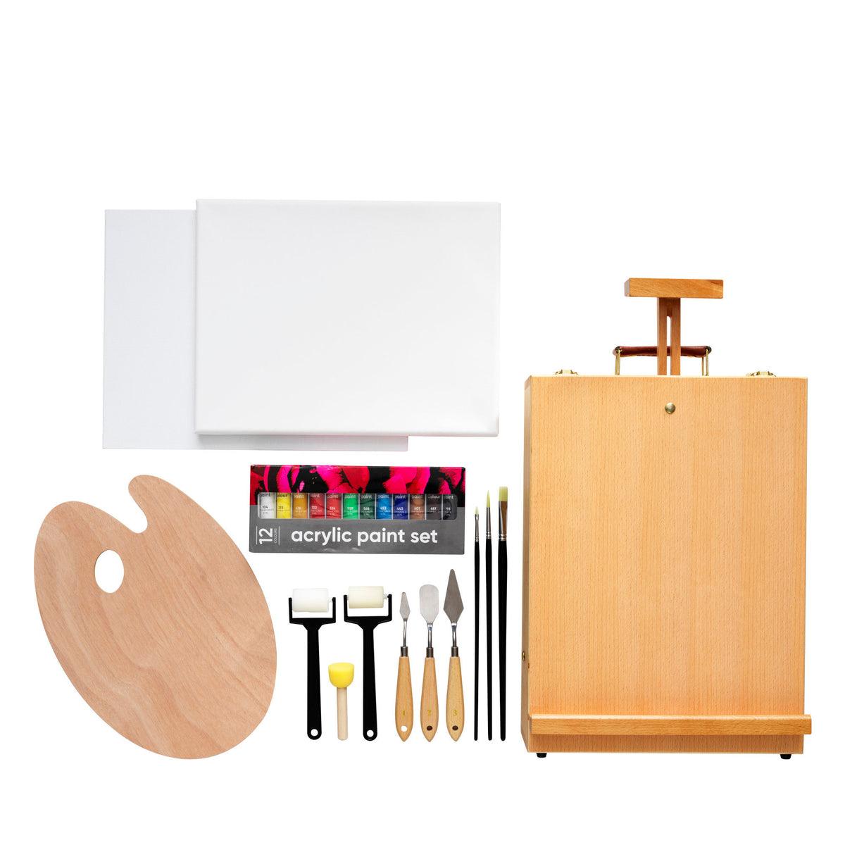 Koffertstaffeli 2-in-1, ikke la noe stå i veien for din skaperlyst – heller ikke fjell, elver eller smale skogsstier. La deg i heller inspirere av dem og bruk dem i dine arbeider med dette komplette og transportable akrylsettet, som samtidig er staffeli og malerkoffert. Her har du alt du behøver for å komme i gang, og kofferten/staffeliet har god plass til flere farger og verktøy. Settet inneholder følgende: