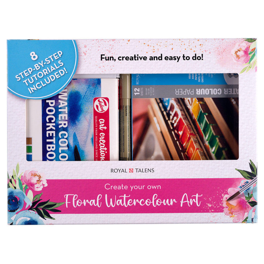 Ønsker du å lære å male vakre blomster med akvarell? Med Royal Talens Floral Watercolor Set har du alt du trenger for å komme i gang med blomsterakvareller. Dette alt-i-ett-settet er spesielt designet for nybegynnere og inneholder nøye utvalgte produkter som gjør det enkelt og morsomt å starte med akvarellmaling.