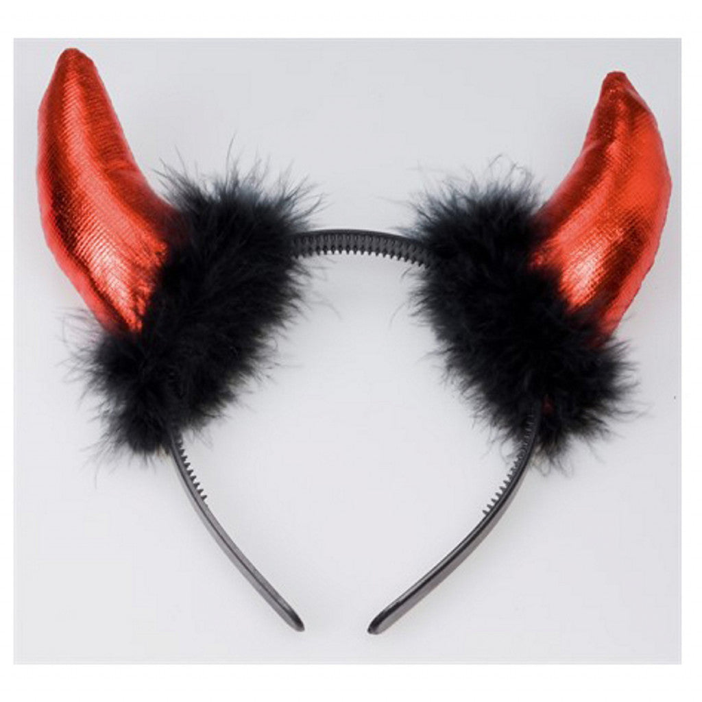 Djevelhorn til Halloween – nettopp stjålet fra en djevel! Hornene er røde, metallicglinsende og er festet i myke, svarte fuskefjær / dun. Hele arrangementet er festet på et svart hårbånd av plast. Perfekt som kronen på verket når du skal på Halloween-feiring, karneval eller i selskap. Husk matchende sminke for å bli skikkelig ond (men ganske søt) og djevelsk!