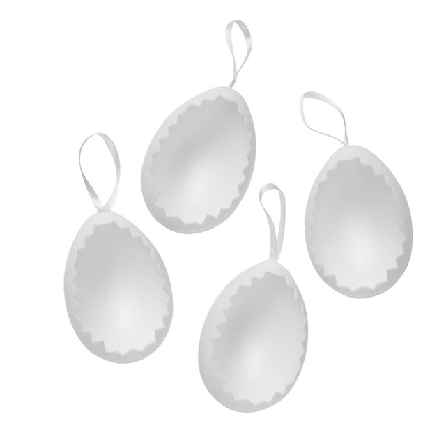 Fire halve plastegg med «taggete» kanter! Merk at egghalvdelene ikke er halvdeler, men faktisk litt større enn som så – og at de ikke kan settes sammen til to hele egg. Nå er det opp til deg å være kreativ og fylle eggene med pynt og hobbymaterialer! Fint klippet påskeris og små kyllinger av leire eller en seng av limte riskorn som det vokser små papirblomster opp av? Og du, ikke vær redd for å finne frem hobbymaling og male eggene, det blir kjempefint! Eggene er 80×55×40 mm store, fremstilt i plast og utstyrt med hvitt bånd til oppheng.