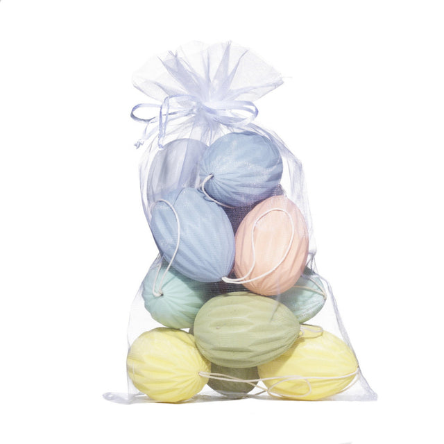 - Eggene leveres i en fin organzapose og har bånd / snor til oppheng