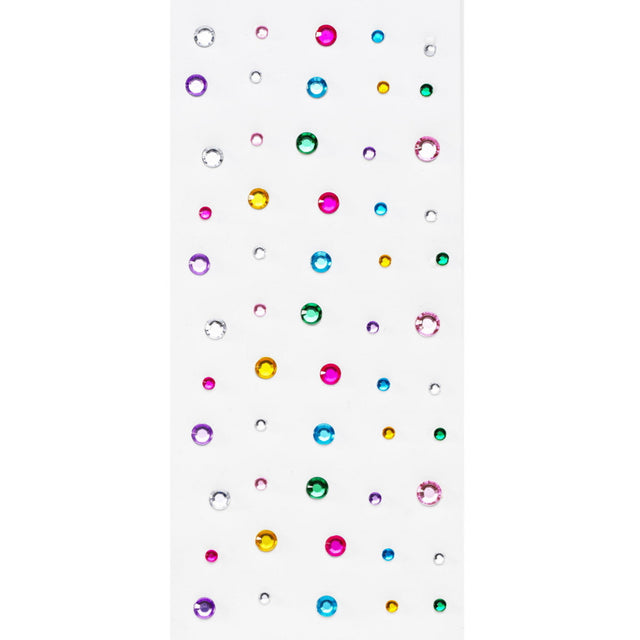 Face Jewels Rainbow Dots – 55 runde og fine ansiktssmykker i ulike farger. Flotte, selvklebende ansiktsjuveler / ansiktssmykker er en fin måte å gi utseendet et løft på når du skal pynte deg til fest eller karneval. De flotte, gnistrende steinene bringer hvem som helst inn i det uvirkeliges verden. Juvelene skal løsnes fra limarket en og en, og skal presses mot ansiktet i 3–5 sekunder. Til sammen tar det litt tid, så få gjerne litt hjelp av en venn. Dessuten er det viktig at ansiktet er rent og tørt når juvelene skal festes – hudkrem eller makeup kan gjøre at limet hefter dårligere. Når alt er på plass, blir det imidlertid en fryd å fortsette reisen med sminke og glitter rundt de flotte steinene.