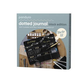 Dotted Journal Black Edition Starter Kit, dotted journaling, eller bullet journaling/bujo – bare med en vri! Prinsippet er det samme: Fargerike ruter og morsomme oppfordringer for å planlegge livet bedre og huske målene du har satt deg, bare på kullsvart papir! Som du sikkert aner, får det gelpenner, akrylpenner og metallicfarger til å skinne på en helt fantastisk måte. Shine bright like a dotted journal! Følgende er inkludert: