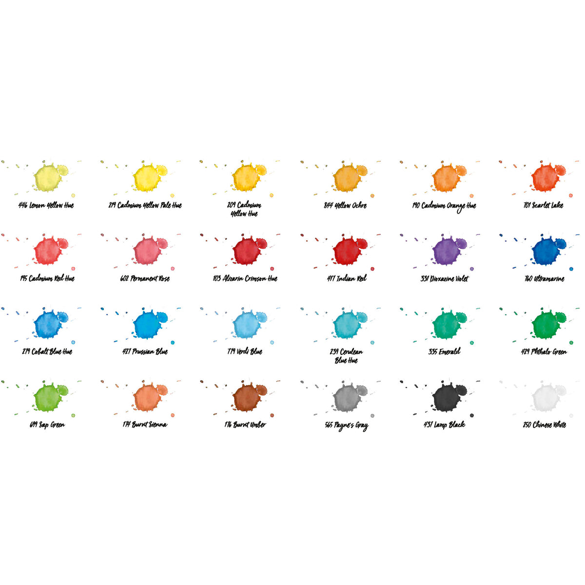24 Half Pans med akvarellfarger i høy studiokvalitet med høy pigmentering.