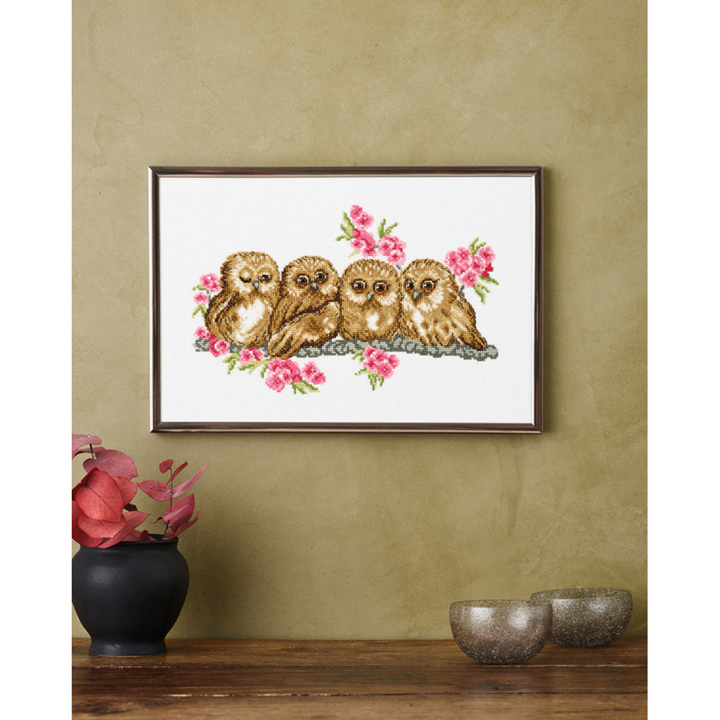Skap et sjarmerende broderi med dette korsstingsbroderisettet som avbilder ugler. Settet inkluderer alt du trenger for å fullføre prosjektet:
