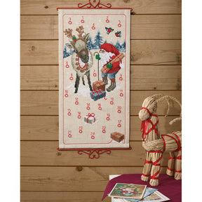 Korsstingsbroderi Adventskalender - Nissen med Reinsdyr 35x67cm