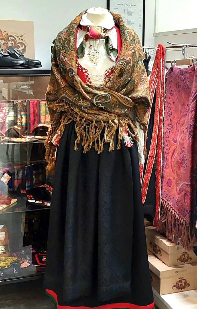 Sjalet blir brukt som tilbehør til bunad, og måler 140 x 140cm.