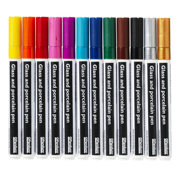 Glass- & porselenspenner, spiss 2 mm, gul, oransje, rød, rosa, lilla, lysblå, blå, grønn, brun, sort, sølv og gull. Rengjør overflaten nøye med et fettløsende middel før dekorering (ikke ta på flaten som skal dekoreres). Rist pennen godt (med korken på), før bruk. Trykk inn spissen mot et papir slik at den blir mettet med maling, tegn motivet. Husk å ikke dekorere inne i krus/kopper eller på midten av tallerkener der bestikket kan skade motivet. La tørke i 4 timer. Herdes deretter i vanlig ovn ved 160 °C i 90 minutter. Sett gjenstanden inn i kald ovn, ta tiden fra når temperaturen er nådd. Avkjøl i ovnen med åpen dør. Tåler maskinvask 55-60 °C etter herding (ikke la dekorerte gjenstander ligge i bløt). Obs! Ikke dekorer på krystall- eller s.k. duralexglass, de tåler ikke herding i ovn! Pennene oppbevares liggende. Pakke med 12 farger.