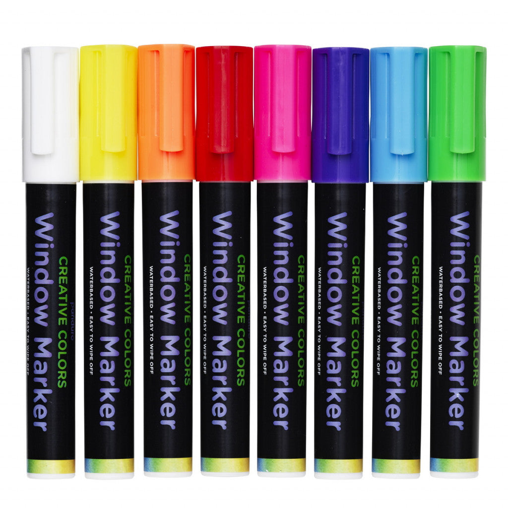 Window Markers / Chalk Markers 8-pakning – store penner med vindusfarge – lyst til å tegne og skrive med fine og fargerike penner på vinduer, glass og speil? Pennene er et morsomt alternativ til vindusmaling og egner seg ypperlig til å live opp hjemme. Ekstra morsomme blir de i høytider som påske, jul og Halloween – det er bare å male i vei på vinduene og spre glede og stemning ut mot gaten – kyllinger, gresskar eller nisser – alt blir fargerikt og fint. Et tips: mal gjerne motiver der øynene forblir umalte og lyset fra hjemmet stråler ut. Forestill deg et gresskar med et ondt smil!