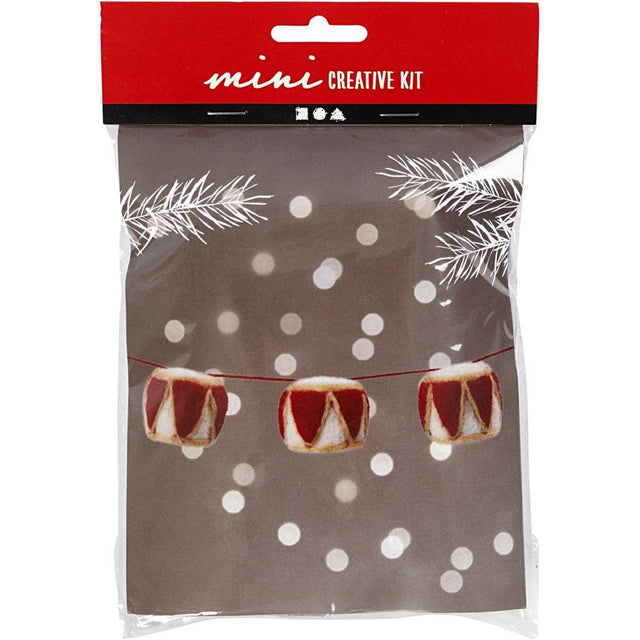 Sett igang julekosen og kreativiteten med dette materialsettet som inneholder materialer til å lage en guirlander med tre nålefiltede trommer i tradisjonelle julefarger. Med den medfølgende veiledningen blir du hjulpet godt igang