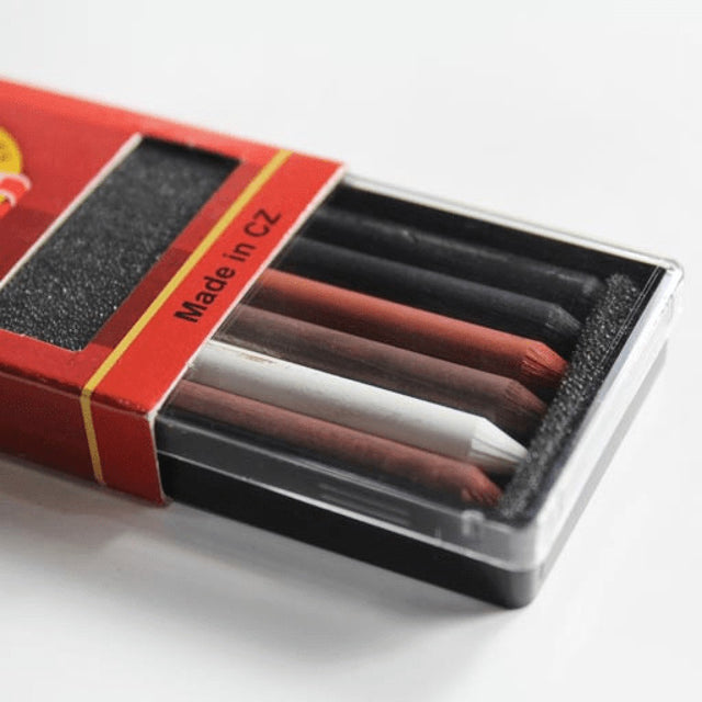 Settet med miner inneholder 1 stk av: Negro 2, Drawing Charcoal 2 (medium kull), hvit pastell, Russet Sepia (Rød sepia), Light Brown Sepia og Dark Brown Sepia.