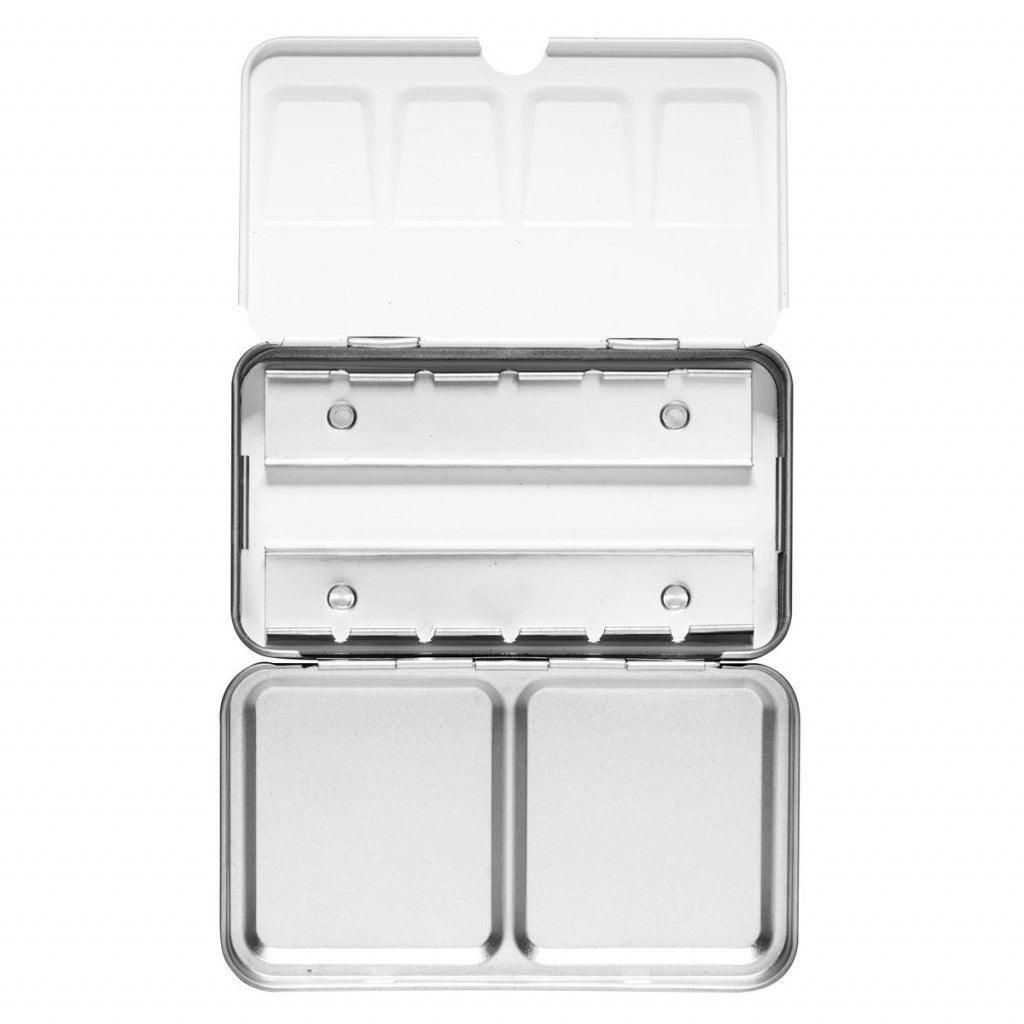 Tom metalleske til akvarellmaling– Nettopp, en helt tom, men utrolig praktisk metalleske med 12 små rom og feste for 12 halfpans/halvkopper/1/2-kopper med akvarellmaling. Dermed kan du selv sette sammen din drømmepalett av farger som du alltid kan ha med deg, både til daglig og på reiser. Vi har naturligvis et kjempestort utvalg av halvkopper fra Winsor & Newton, så det er bare å velge og vrake. En annen praktisk ting med denne esken er at den har to lokk som kan slås ut: Et med to store ruter for blanding av maling og et med fire mindre ruter.