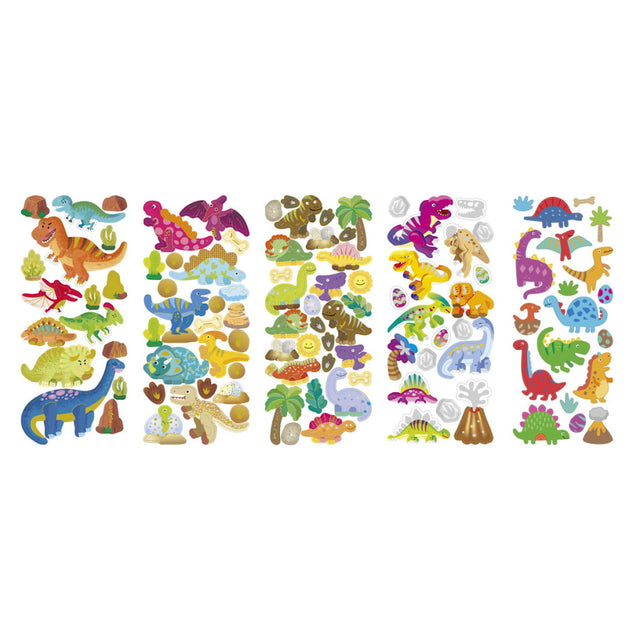Stickers / klistremerker 10 stk Dino-Roar – løp for livet, dinosaurene kommer! Noen er sinte, andre er blide. Ingen grunn til å ta noen sjanser! Fremstilt i plast / papir. Detaljer i gull metallic og glittertrykk. 5 ulike motiver, 2 ark av hvert. 7,5×10 cm. Fra 3 år.