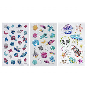 Stickers 3p Space Travel – store og fine stickers / klistremerker med diverse spesialegenskaper som virkelig gjør dem til noe for seg selv! 3 ark à 16×10 cm. Besøkende fra verdensrommet! 1 ark med crystal stickers (perlestickersr), 1 ark med vanlige stickers med sølv metallic, 1 ark med vanlige stickers med sølvglitter. Plast. Fra 3 år.