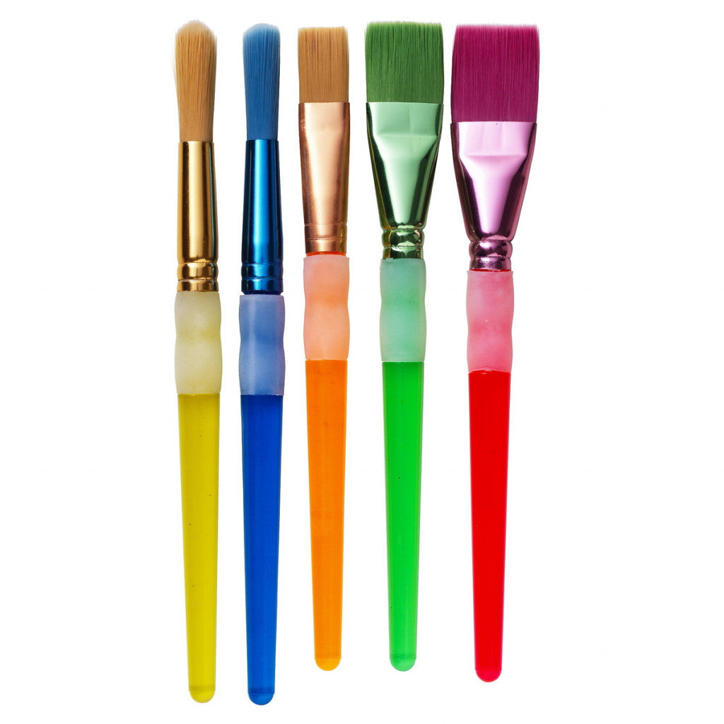 5 utrolig fine og fargerike barnepensler med store penselkropper av transparent plast og gummi nederst for godt grep. Små og kreative hender har stor glede av litt større og gripevennlige pensler for å oppnå et godt resultat og trening av finmotorikken når de maler.