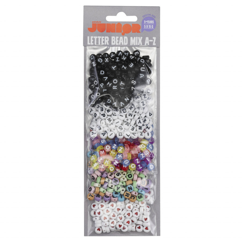 Perlemiks bokstaver, av akryl til smykkelaging. Perler i fem ulike design. Lag fine armbånd og halsbånd. Leveres i fem poser. Innhold, totalt 75 g fordelt på ca. 610 perler.
