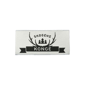 Symerke med tekst/motiv i tynn, vevd kvalitet. Kan vaskes på 40 grader. Skogens konge. Størrelse: 50x25mm.