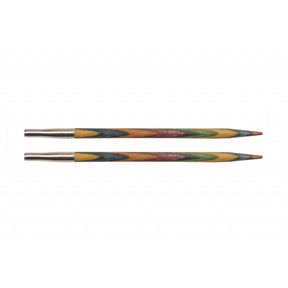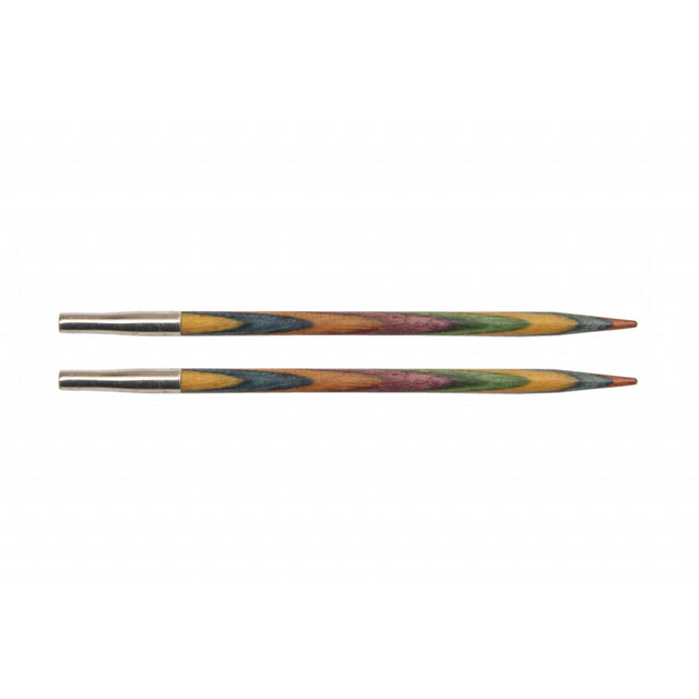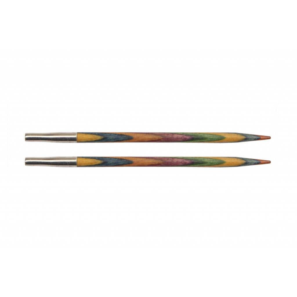 Symfonie utskiftbare rundpinner i regnbuefarget bjørkefinèr er fantastiske å strikke med. Akkurat passe spisse, og overgangen mellom spiss og pinne går gradvis slik at maskene glir lett på plass.
