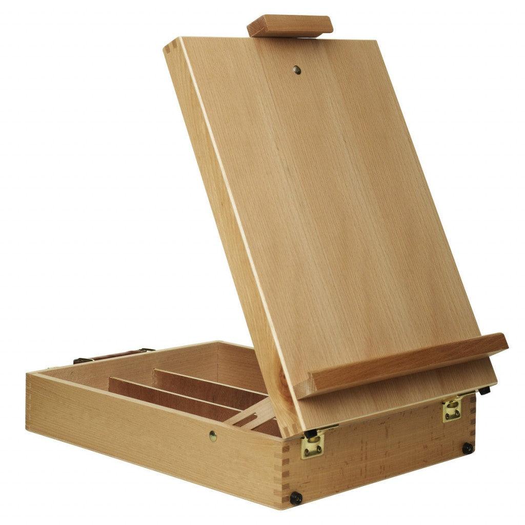 Table Easel, en meget praktisk kombinasjon av staffeli og oppbevaring – til stor glede for den som er på farten eller har litt mindre plass. Selve staffeliet er fremstilt i bøk og har et stort håndtak i lærimitasjon. Låsen, hengslene og staffelispennene er fremstilt i jern belagt med kobber. Når lokket slås opp, danner kassen en praktisk oppbevaringsplass med 3 lange og smale avdelinger som rommer mye (39 cm lange og 5 cm dype – total bredde 28 cm). Oversiden av lokket utgjør selve staffelifronten – slå opp og spenn fast i ønsket vinkel – og du har et staffeli der du kan plassere et lerret og dessuten justere høyden! Maksimal lerretshøyde er 65 cm og maksimal dybde 24 mm. I sammenslått stilling er kassen 41 x 29 x 10 cm.