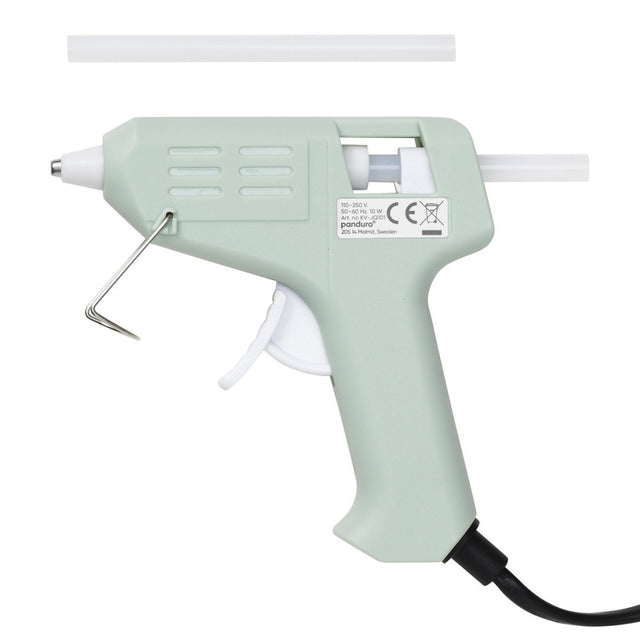 Verktøyet er ergonomisk utformet, lett å jobbe med og har en 175 cm lang ledning som gir god rekkevidde. Foran har den en metallbøyle som kan felles ned ved behov hvis du vil at limpistolen skal stå eller henges opp etter bruk. Lav temperatur. EU-støpsel. 10 W, 220-250 V. 2 stk. limstaver (Ø7 mm) er inkludert. Limet er fremstilt uten animalske ingredienser.