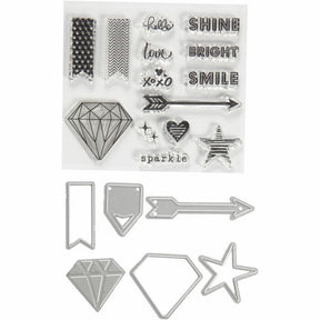 Innhold: 5 stempler, 1 embossingsjablong og 3 skjæresjablonger.