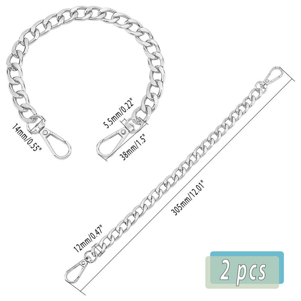 Et sett med to 30 cm lange veske- eller skulderlenker i solid aluminium med svingbare karabinkroker. Perfekte som reservehåndtak eller dekorativ detalj til vesker og DIY-prosjekter.