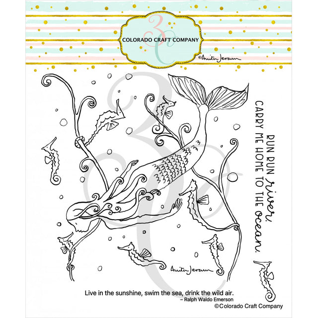 Dykk inn i din kreative side med Mermaid and Seahorses Clear Photopolymer Stamp Set med illustrasjoner av Anita Jeram for Colorado Craft Company. Settet inkluderer gjennomsiktige photopolymer stempler med et stort firkantet stempel av en majestetisk havfrue som svømmer gjennom sjøhester, tang og bobler. Settet inkluderer også et enkelt sjøhest-stempel. Denne 6,5x8 tommer pakken inneholder Mermaid and Seahorses-stempelsettet som måler 6x6 tommer. Det inkluderer 4 stempler: 2 bilder og 2 utsagn. Det største stempelet er 5,2x5,2 tommer og det minste stempelet er 0,5x1,2 tommer. Stempler kan brukes med den koordinerende Mermaid and Seahorses die-settet som selges separat (AJ757-D). Utsagn inkludert i settet: Run, run river, carry me home to the ocean og et sitat av Ralph Waldo Emerson: Live in the sunshine, swim the sea, drink the wild air.