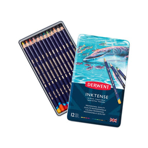 Akvarellblyanter "Inktense", - en ny generasjon akvarellblyanter fra Derwent. Intensive farger med transparent effekt. Tegn en strek med blyanten, fukt med pensel og tegningen får et blekklignende uttrykk. Du kan bruke blyantene som vanlige fargeblyanter, men også som akvarellmaling med vann. Det går også bra med lag-på-lag, legg på neste lag når fargen under har tørket. Når det ferdige bildet har tørket blir resultatet permanent. Inktense kan også brukes på tekstiler, f.eks. bomull og silke. Leveres i praktisk metalleske. Pris pr. sett. 12 farger: Sun Yellow, Tangerine, Poppy Red, Fuchsia, Deep Indigo, Sea Blue, Teal Green, Apple Green, Leaf Green, Baked Earth, Bark, Ink Black.
