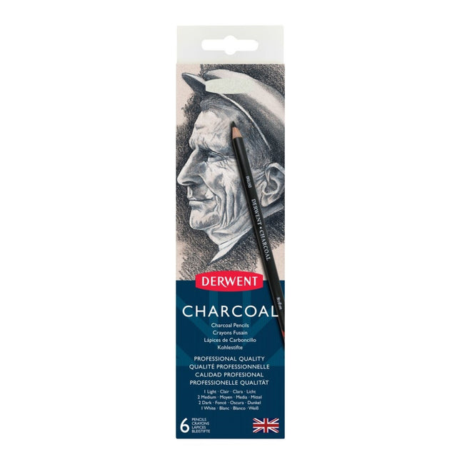 Sett med 6 Charcoal pencil (kullblyanter) 1stk Light, 2stk Medium, 2stk Dark og 1stk Tinted Charcoal i hvit.