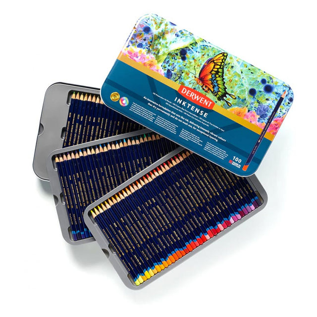 Akvarellblyanter "Inktense", - en ny generasjon akvarellblyanter fra Derwent. Intensive farger med transparent effekt. Tegn en strek med blyanten, fukt med pensel og tegningen får et blekklignende uttrykk. Du kan bruke blyantene som vanlige fargeblyanter, men også som akvarellmaling med vann. Det går også bra med lag-på-lag, legg på neste lag når fargen under har tørket. Når det ferdige bildet har tørket blir resultatet permanent. Inktense kan også brukes på tekstiler, f.eks. bomull og silke. Leveres i praktisk metalleske. Pris pr. sett. 100 farger: Alle Derwents Inktense-farger.