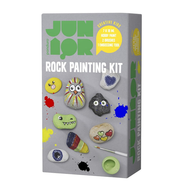 Rock painting kit, å male på stein er tidløs moro for så vel ung som gammel. Først går man ut i naturen og finner gøyale steiner. En rund stein kan kanskje bli et smilefjes, og denne ligner da vitterlig på et hjerte? Morsomme former blir morsomme å male! Settet inneholder