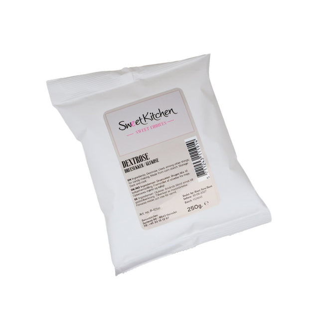 Druesukker (Dekstrose), pakke med 250 gram. Dekstrose er et glimrende smaksstoff og søtningsmiddel til drops, godteri, bakverk, iskrem, sorbet, marmelade og fruktkrem. Siden det bare er 60–70 % så søtt som vanlig sukker, gir det en mer diskré sødme. En annen fordel når du skal lage iskrem og sorbet er at dekstrose ikke danner like mye iskrystaller, noe som gir mykere konsistens og bedre smak. Innhold: Dextrose. Opbevares mørkt og køligt.