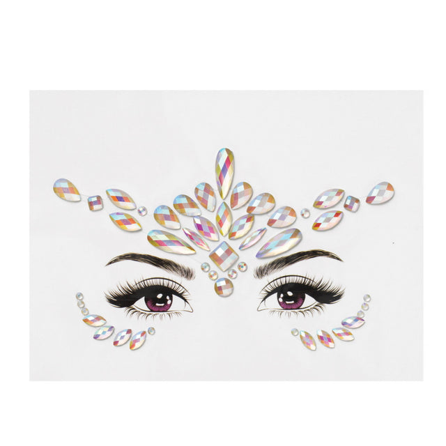 Det er viktig at ansiktet er rent og tørt når juvelene festes, hudkrem eller makeup kan gjøre at limet hefter dårligere. Når alt er på plass, blir det imidlertid en fryd å fortsette reisen med sminke og glitter rundt de flotte steinene. Motivet er 14 cm bredt.