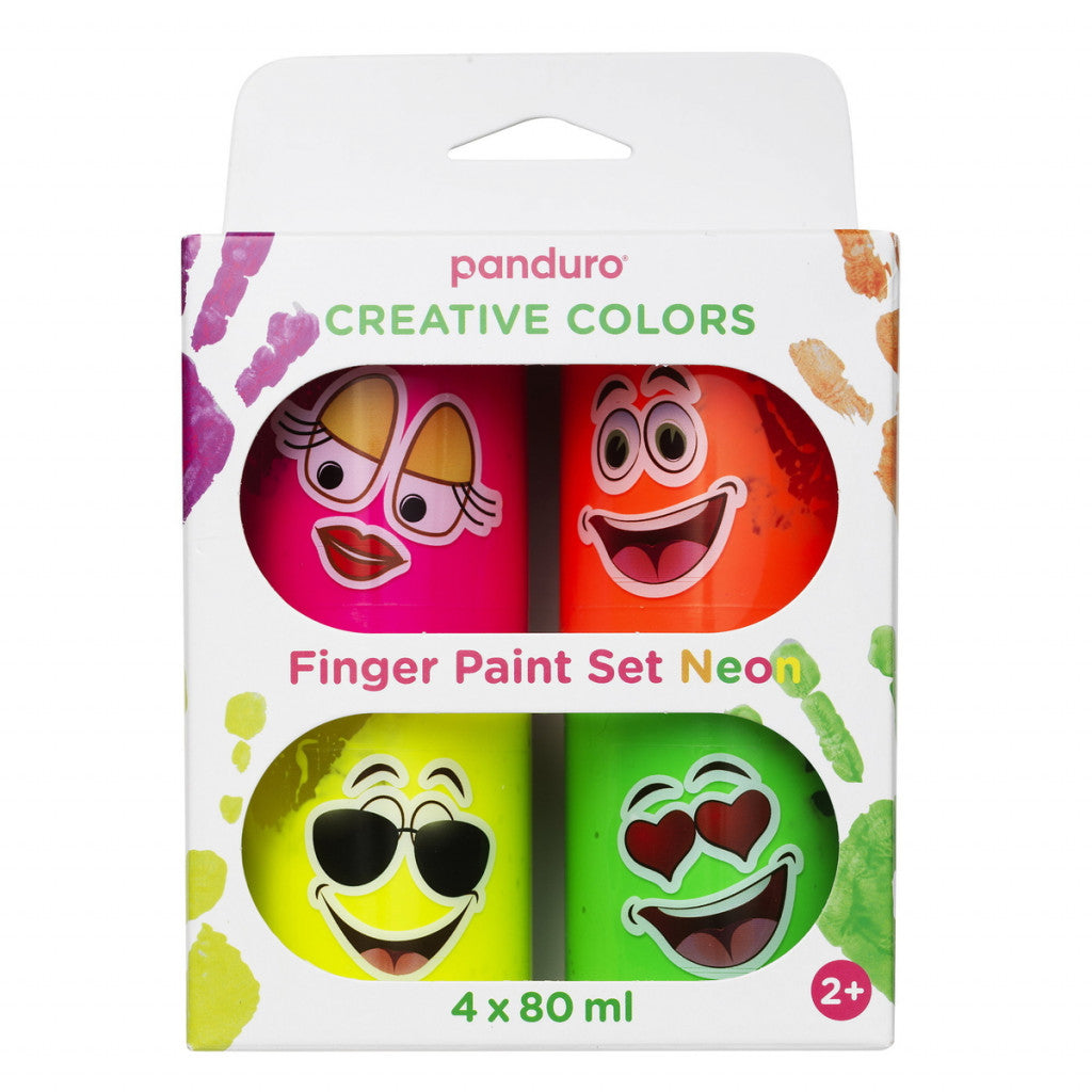 Fingermaling Neon 4-pakning, en klisset og kreativ klassiker som er de fleste barns første bekjentskap med maling og skapende virksomhet. Pakken inneholder 4 bokser à 80 ml med kremede neonfarger (oransje, gul, grønn og rosa). Malingen egner seg best på papir, kartong, tre og stein, og kan tynnes ut med vann ved behov. Maling er lettarbeidet, dekker godt og kan også påføres med pensel og svamp.
