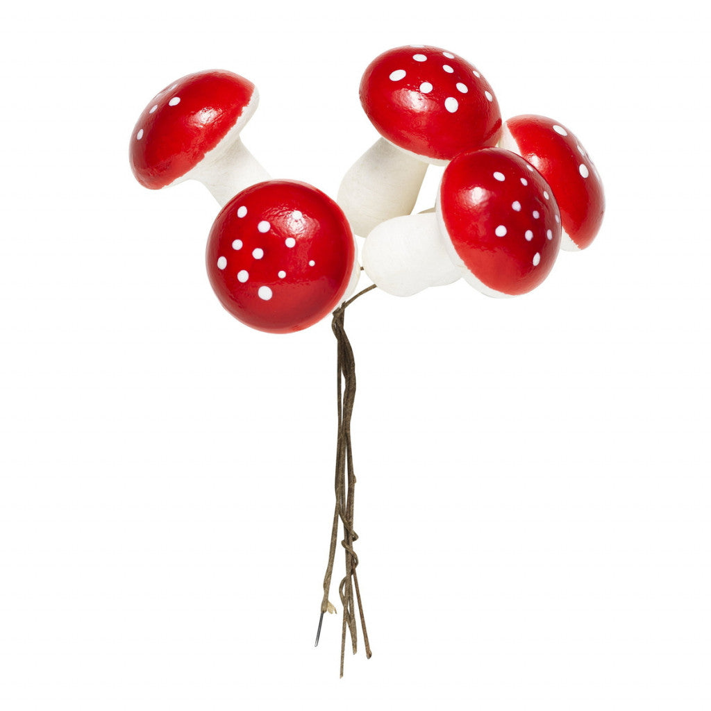 5 fluesopper på metalltråd. Flotte dekorasjoner av vatt på bøybar metalltråd for å pynte med i granbar, kranser, stammer eller mose – men også fine å bruke i nisseland / miniatyrverdener og på julegaver. Hatten på soppene er 33 mm i diameter.