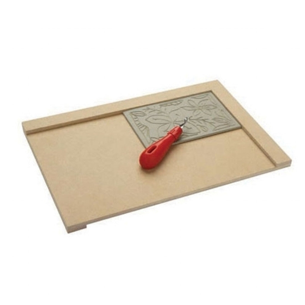 Arbeidsplate som legges an til bordkanten og hindrer at linokniven fyker ut av arbeidsområdet, noe som lett kan skje når man mister taket i linoplaten. Samtidig beskytter man bordflaten. Et godt sikkerhetsverktøy i skole- og kurssammenheng.
