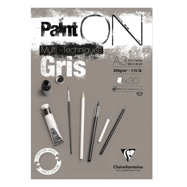 Paint ON Multi Techniques, Clairefontaine. Tegneblokk i A3-format (297x420 mm), for alle teknikker. Passer til akryl, blekk, oljepastell, gouache, blyant, kull, tusjer og collage/mixed media teknikker. Limt i overkant. Syrefritt papir 250 g. Inneholder 30 ark. -Grått papir