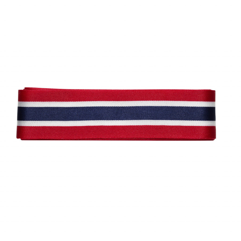 Et dekorasjonsbånd i Norges farger! Enten det er nasjonaldagen 17. mai, russefest, konfirmasjon, feiring eller sport i gang, kan anledningen dekoreres med dette 3 meter lange tøybåndet som lyser i rødt, hvitt og blått! Båndene finnes i tre forskjellige bredder. Dobbeltsidig vevd og fremstilt i 100 % polyester. Kan vaskes på 30 °C.
