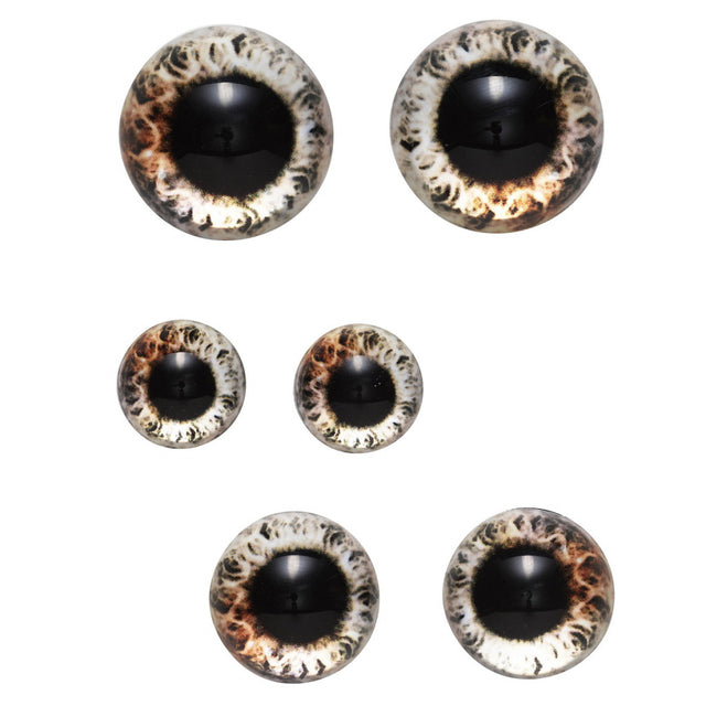 Øyne av glass, perfekte for en mengde bruksområder. Til kjepphest / Hobby horse, eller kanskje du vil gi en pute eller et bilde det lille ekstra? Pakken inneholder 6 brune øyne av glass – øynene er flate på baksiden. Mål: 2 stk. er 15 mm i diameter, 2 stk. er 20 mm og 2 stk. er 25 mm. For ting som skal være i bevegelse eller brukes mye, anbefaler vi å bruke et sterkt universallim eller limpistol.