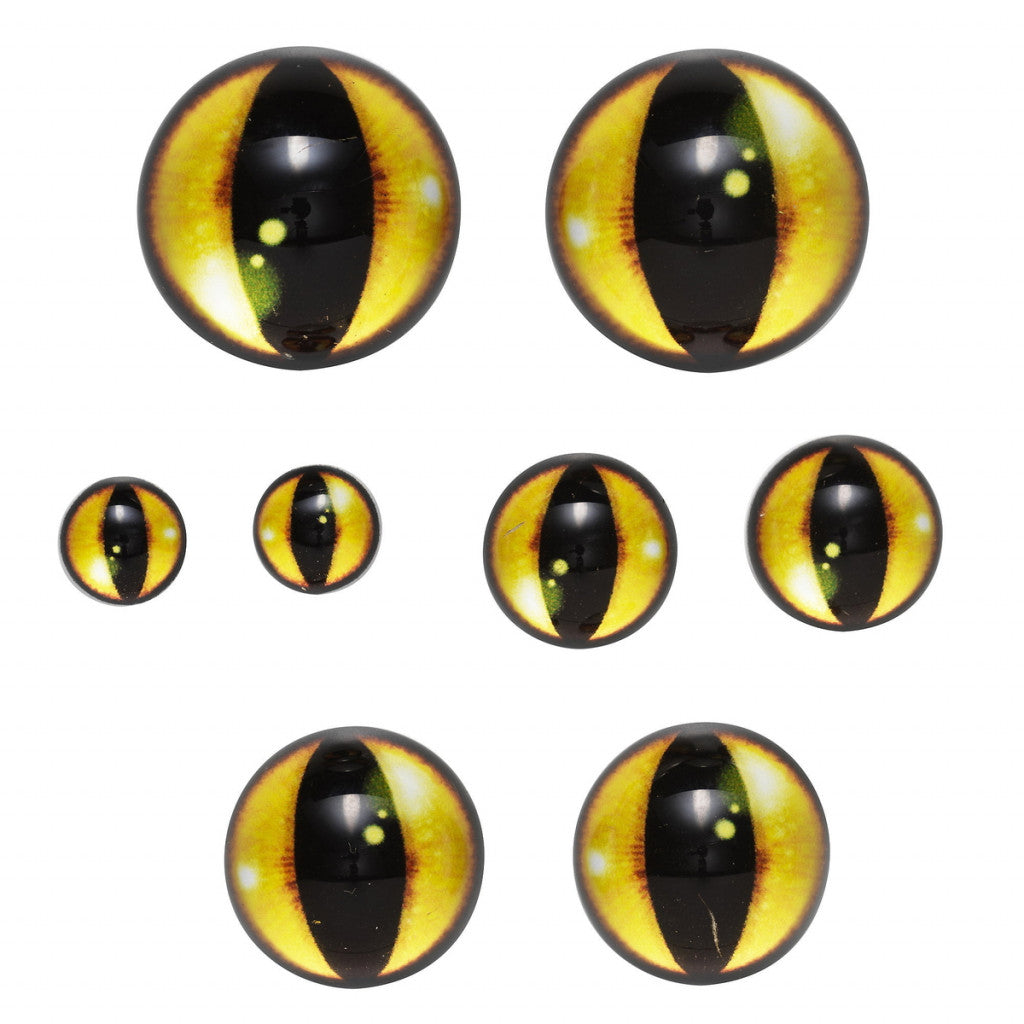 Øyne av glass, perfekte for en mengde bruksområder. Til kjepphest / Hobby horse, eller kanskje du vil gi en pute eller et bilde det lille ekstra? Pakken inneholder 8 gule tigerlignende øyne av glass – øynene er flate på baksiden. Mål: 4 stk. er 15 mm i diameter, 2 stk. er 20 mm og 2 stk. er 25 mm. For ting som skal være i bevegelse eller brukes mye, anbefaler vi å bruke et sterkt universallim eller limpistol.