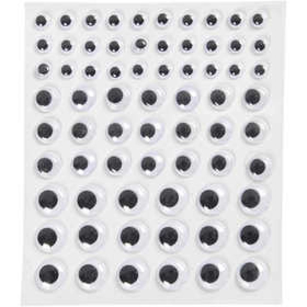 Ark med selvklebende rulleøyne i 3 størrelser. Alle runde og hvite med svarte, bevegelige pupiller bak klar plast - i alt 69 stk.