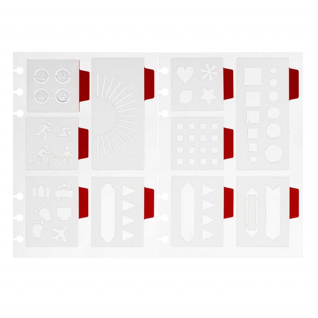 Sjablonger til punktjournal, flotte, lett selvklebende sjablonger med gøyale ikoner, ord, ruter og tags som gjør det enda morsommere å skreddersy punktjournalen med tekst og illustrasjoner! Alle sjablongene er samlet på ark (17,5 x 12,4 cm) med hull som passer i almanakk. Ta dem ut, klistre dem på og tegn i eller langs dem – eller hvorfor ikke bare male i noen av dem? Raskt, pent og enkelt. Når du er ferdig, trekker du ganske enkelt sjablongen av papiret og setter den tilbake på plass igjen. To ark med mellomstore ikoner, vimpler, tags, firkanter, sirkler og store måleinstrumenter.
