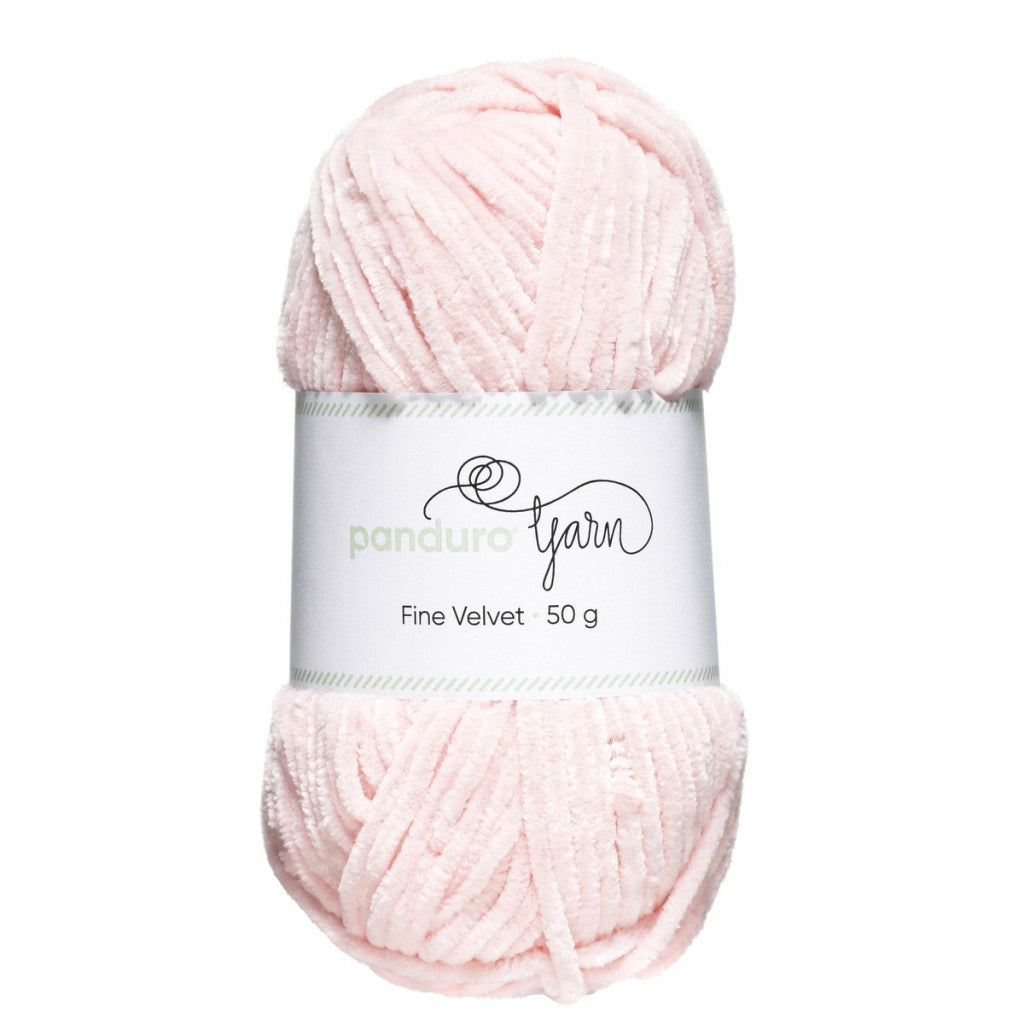 Panduro Yarn Fine Velvet er et like himmelsk mykt garn som Soft Velvet, men litt tynnere. Garnet føles som fløyel, chenille eller plysj mot huden. Passer fint til f.eks. et koselig pledd, et skjerf eller en myk lue. Et godt heklegarn som ikke frynser seg. Fargeskalaen er dropsfarget som gir en følelse av sorbet og lys herlig vår. Heklet feil? Løft maskene forsiktig av ved hjelp av heklenålen eller pinnene uten å dra i garnet, så holder det seg fint.