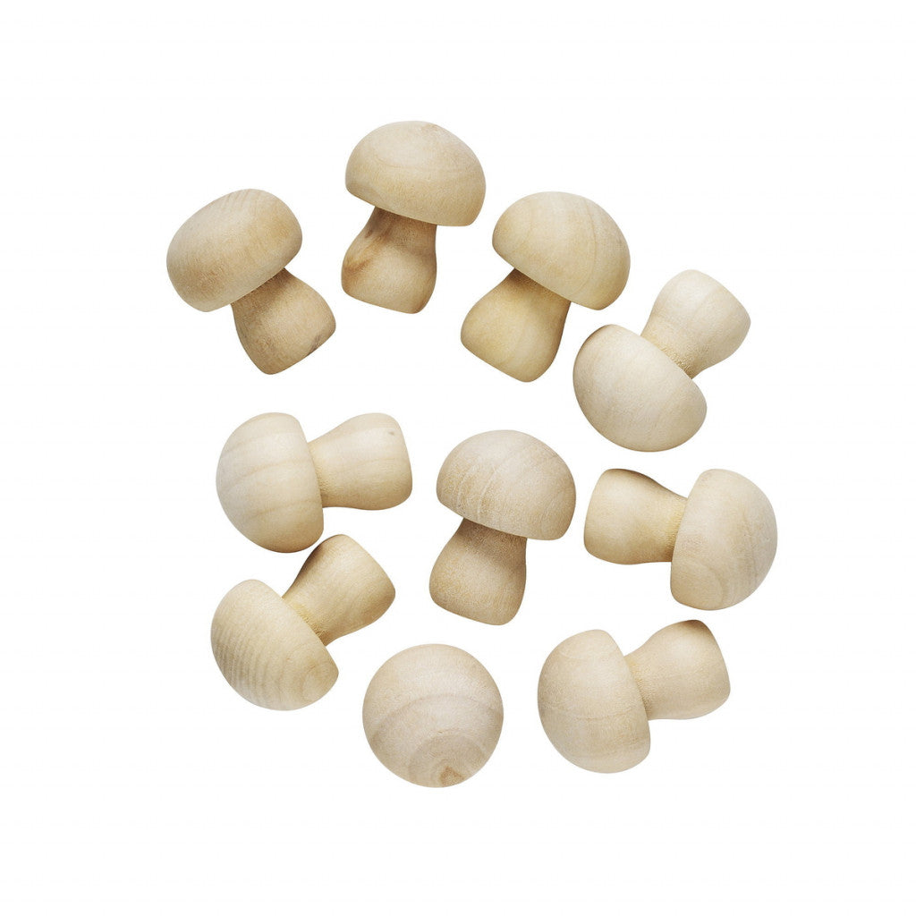 Wooden mushrooms – 10 søte, runde og umalte tresopper fra eventyrenes, seriebladenes og et visst TV-spills verden. Soppene er 35 mm høye, har en diameter på 15 mm ved foten og 25 mm der hatten er bredest. Soppene er fremstilt i lyst shimatre. De er veldig fine, men kanskje litt for fargeløse for noen – så frem med maling, pensler, glitter og alt du kan tenke deg – det er tid for DIY og julehobby, der du kan lage flotte detaljer til miniatyrlandskaper og nisseland, men også til mosen på adventsstaken eller julebordet.