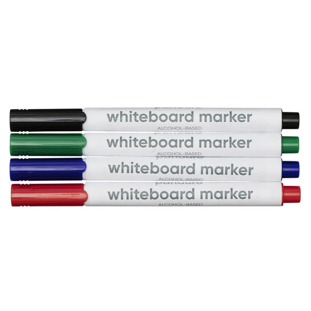 Panduro whiteboardpenner, alkoholbaserte, til whiteboard/utviskbare tavler av metall og plast – Lengde 14 cm. Fire farger: Rød, blå, grønn og svart. Pakke med 4 stk. Oppbevares liggende. Hvis du synes at en ny penn har svak farge, lar du den stå opp ned i noen timer. Da kommer fargen ned i spissen. 1 mm spiss.